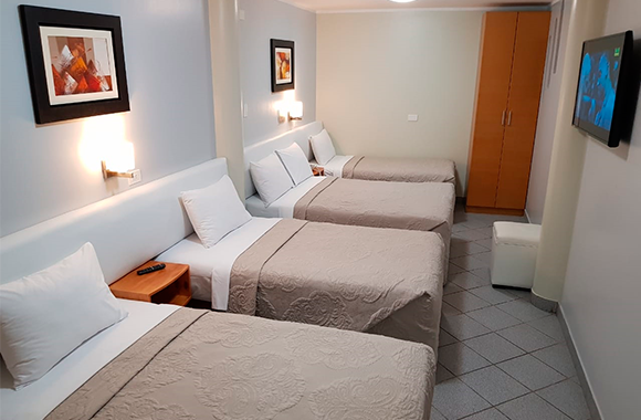 , está situada en el 3° nivel, cuenta con una cama de 2 plazas y 3 camas de plaza y media